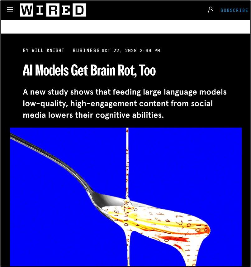 Un ulteriore elemento di complessità riguarda la qualità cognitiva dei modelli stessi. Ricerche recenti mostrano che sistemi addestrati su grandi volumi di dati social, caratterizzati da rumore, polarizzazione e bassa qualità informativa, manifestano un calo delle capacità di ragionamento. Emergono fenomeni come il thought-skipping, l’indebolimento delle catene logiche e anomalie nei test psicometrici.