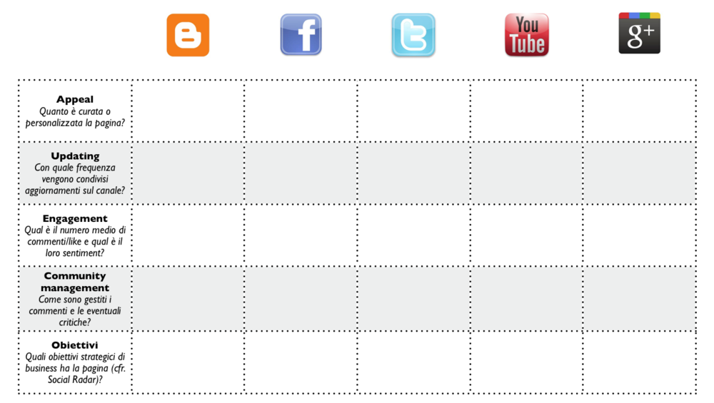 Il primo strumento lo chiamo Social Radar e ci aiuta a identificare secondo alcuni assett la presenza online di un brand verso quali obiettivi strategici è collocata.