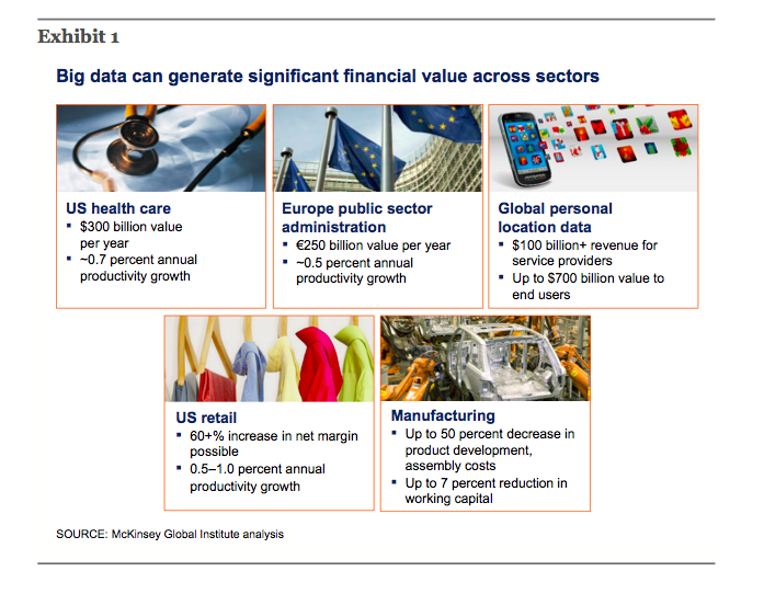 Alcune proiezioni di McKinsey sottolineato poi come i Big Data possano contribuire a innalzare di molto la produttività e il ritorno dell’investimento in alcuni specifici settori e industry: