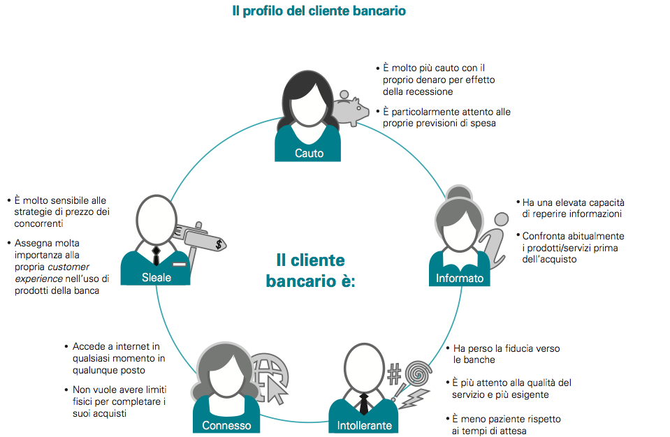 - Il nuovo cliente delle banche è un consumatore che ricalca le logiche del social customer di cui più e più volte abbiamo parlato in questa e in altre sedi. E’ un consumatore molto più consapevole, più informato, che orienta i propri comportamenti di acquisto di beni e servizi a seconda di quelle che sono le opinioni dei propri pari. Opinioni che ricerca attivamente tramite i network e opinioni che gli giungono attraverso le nuove logiche push introdotte dai social media. E’ un consumatore che tende a connettersi con persone che gli somigliano e ad avere una aspettativa sempre maggiore. Pretende di essere ascoltato e ha molta più voce rispetto al passato.
