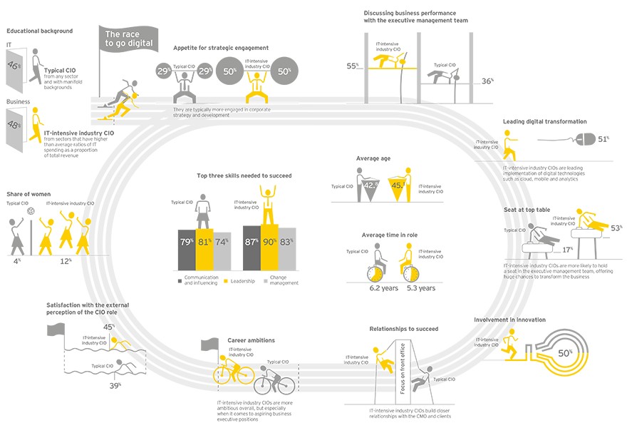 - I CIO che intendono intraprendere o che hanno intrapreso le sfida della trasformazione digitale si muovono su alcuni asset fondamentali che li contraddistinguono dagli altri: innovano in modo costante e strategico, hanno una chiara visione di come la tecnologia stia radicalmente cambiando il modo di concepire e di organizzare le imprese, comprendono che il digitale è uno strumento e sanno collegarlo ai driver fondamentali di business dell’azienda massimizzando il valore che è possibile ottenere da questi strumenti.